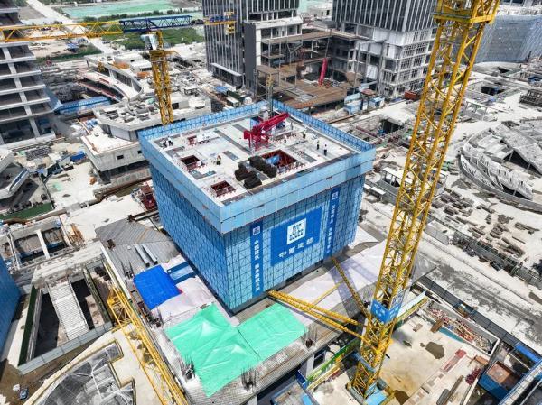 站在江北新区地下空间一期位置,一幢幢高楼正拔地而起。记者眼前被方形蓝色钢网密封的空间,便是完成组装的造楼机。它"坐"在4层楼上,从第五层开始,将由造楼机开启新的造楼方式。