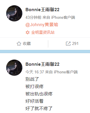 之后,有网友晒出王雨馨和黄景瑜家人游玩照片,还有王雨馨脸部受伤正面照和守孝的照片。此前该网友还爆料称:"黄景瑜劈腿家暴实锤""黄景瑜你的一切污点都会洗白成不实情,踩着王雨馨上来!"还称黄景瑜劈腿张艺上。