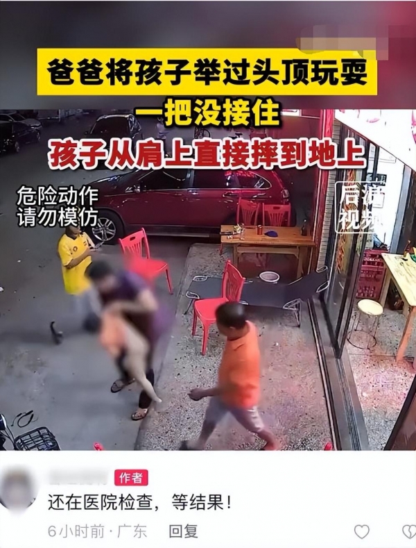 近日,广东东莞发生了一起令人揪心的意外,一位爸爸与孩子的玩耍时光转瞬间变成了惊恐的一幕。监控录像记录下了这位爸爸将孩子举过顶玩耍,不料孩子从肩膀上滑落,头部重重地摔在地上。这位爸爸立即抱起孩子,心疼地安抚。据孩子家属称,孩子已前往医院进行检查,目前正在等待检查结果。