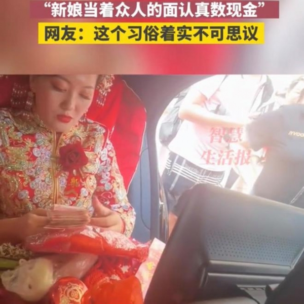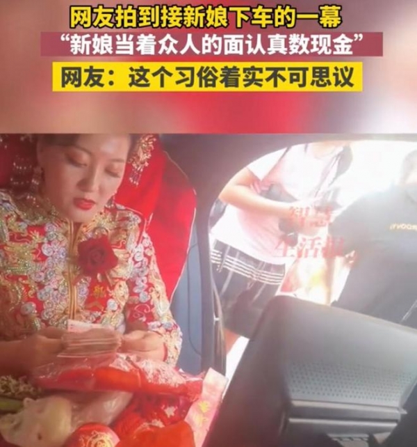 近日,一段新娘坐在车上当着众人数现金的视频引发关注,有网友吐槽,这场面和父母卖了猪数钱的表情真像。