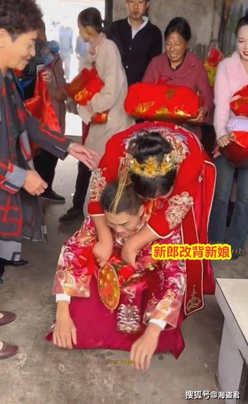 看着新娘有点不高兴,旁边有大妈立马出主意,表示抱不动,背也是可以。