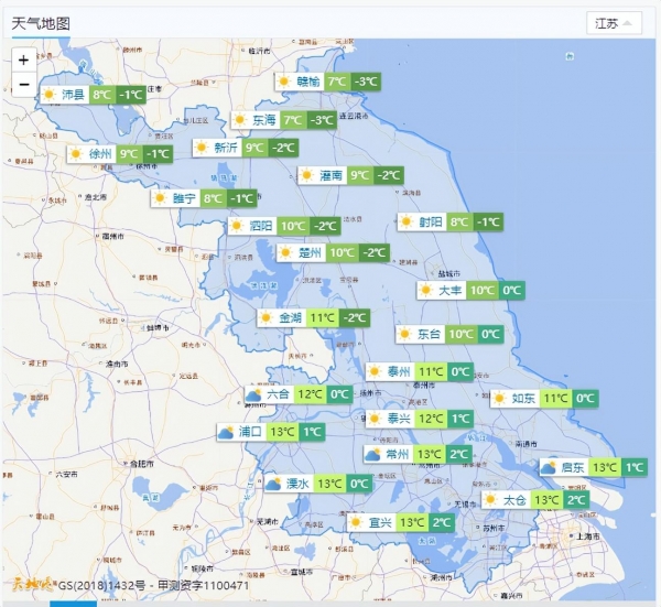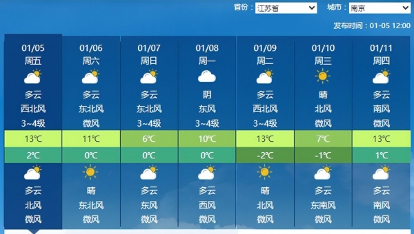 相比东北下跌迅速,江苏各地1月5日气温仍在7-13°C,比前一日升高4-6°C,属于冷暖交替前的"峰前增温"。受此影响,江苏6-7日将出现6-8°C的降温。