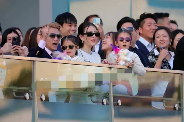 比赛开始后,全家人都定睛观看,起初郭富城的爱驹"舞林密码"展现出了夺冠之势,郭富城带着小女儿挥拳,情绪十分激昂,长女Chantelle也张着嘴神情可爱。