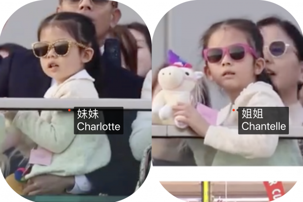 姐妹俩身穿同样的衣服,扎着一样的高马尾,从侧面看像极了双胞胎,就连张着的嘴巴都是一模一样。最后,郭富城的爱驹名列第三,全家都表现出了失望的神色。