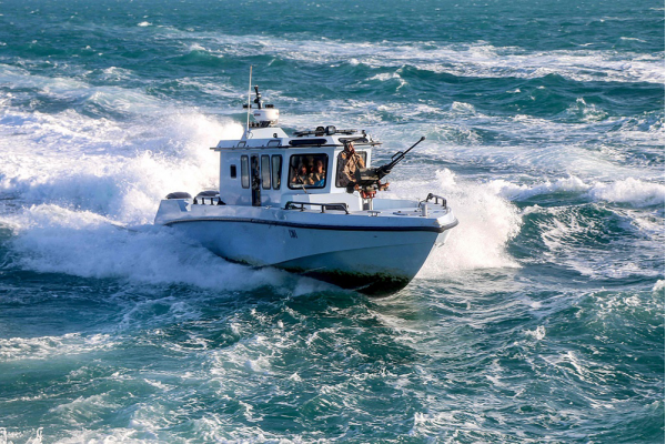 当地时间2023年12月12日,红海海域,也门海岸警卫队成员乘坐快艇在也门塔伊兹省莫卡镇附近的红海上巡航。视觉中国 资料图