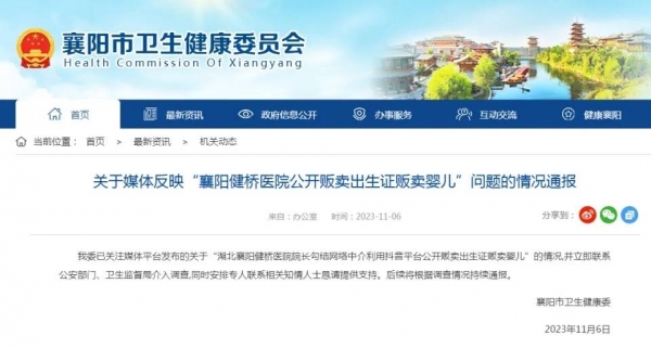 11月6日,襄阳市卫生健康委发布情况通报:我委已关注媒体平台发布的关于"湖北襄阳健桥医院院长勾结网络中介利用某视频平台公开贩卖出生证贩卖婴儿"的情况,并立即联系公安部门、卫生监督局介入调查,同时安排专人联系相关知情人士恳请提供支持。后续将根据调查情况持续通报。