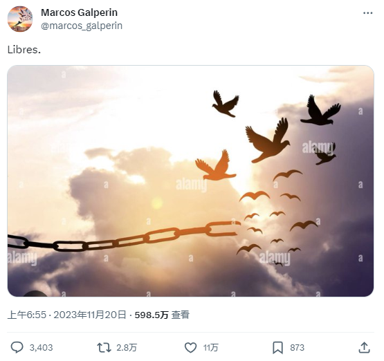 电子商务巨头美客多创始人兼首席执行官马科斯·加尔佩林此前经常批评阿现任总统费尔南德斯领导的庇隆主义政府,阿总统竞选尘埃落定后,他在X平台(原推特)上发布一张小鸟挣脱锁链的图片,并配文:"自由"。