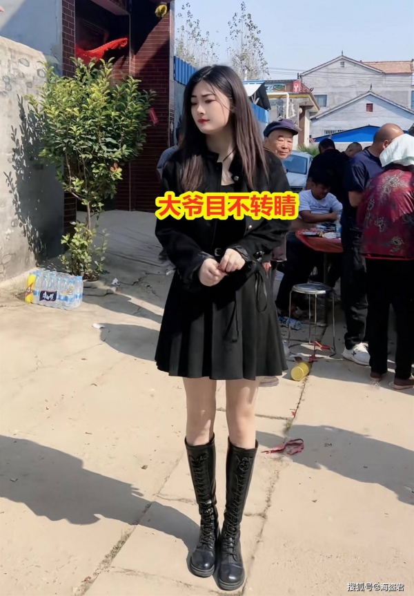 这天女子穿的很漂亮,黑色上装搭配黑色短裙,再踏上一双黑色长靴,将自己的气质展现得淋漓尽致。