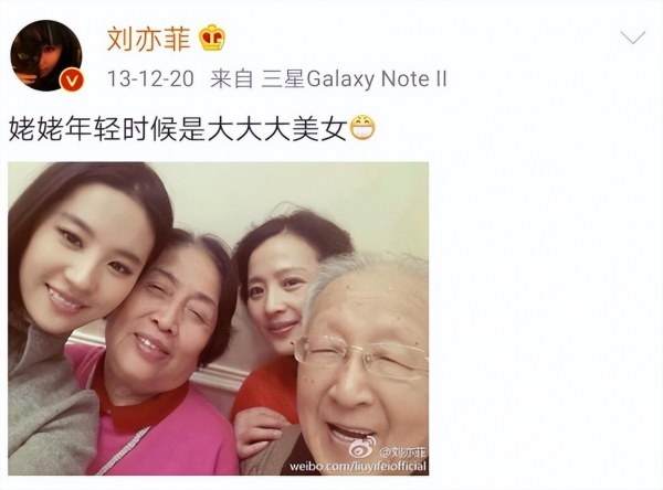 此前,2013年12月20日,刘亦菲曾晒出和长辈合照,称"姥姥年轻时候是大大大美女。"