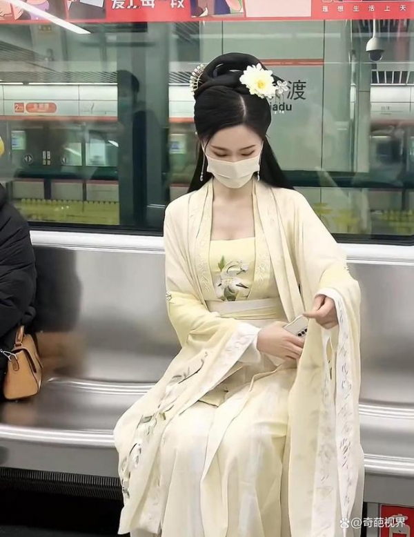 视频画面中这位身材妙曼长相甜美的小姐姐刚走进地铁车厢,就吸引来了所有人的目光,只见她妆容精致,高高的发髻在头上挽起,戴着靓丽的茉莉花头饰进行点缀,接着一袭米黄色"唐褙子"汉服加身。
