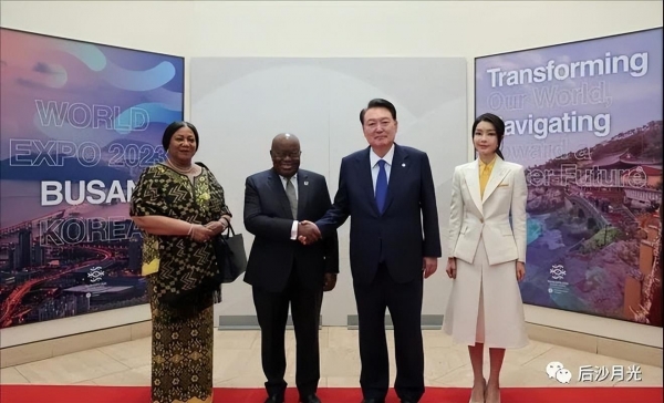 然后,尹锡悦夫妇借着联合国大会平台,向非洲国家拉票,凡是合影,背景板一定带有BUSAN(釜山)