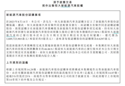 其中,由中国恒大、许家印及其附属公司所提供相关贷款转换的全部48.58亿股新股份中,其中32.36亿股将存入保管账户并用作中国恒大将发行之强制可交换债券的交换财产。其中16.32亿股将为A2恒大汽车股票挂鈎票据,或C2恒大汽车股票挂鈎票据之利益存入保管账户。丁玉梅及其附属公司提供之相关贷款将转换为新股份,但不构成中国恒大集团债务重组的一部分。