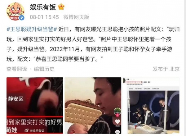 据悉,消息的来源是新浪娱乐明星频道官方账号"娱乐有饭",该博主晒出一段关于王思聪的视频截图,称这就是王思聪抱小孩子的照片。