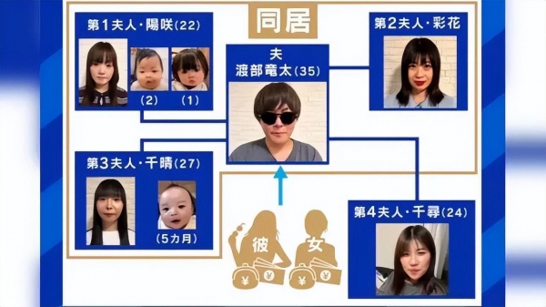 一夫多妻制的婚姻生活并不常见。不过,最近日本一名男子渡部龙太,成为网友瞩目的焦点,因为他登上电视节目,自称「一夫多妻软饭男」,目前的他已和4名妻子同居,并生有3名孩子,另外外头还有2名女友。