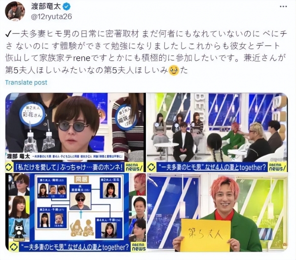35岁的渡部龙太住在北海道札幌市,21日接受日本电视节目《ABEMA Prime》访问,透露他现在与3名妻子和2名女友同居,他的老婆们也有一起上节目露面。