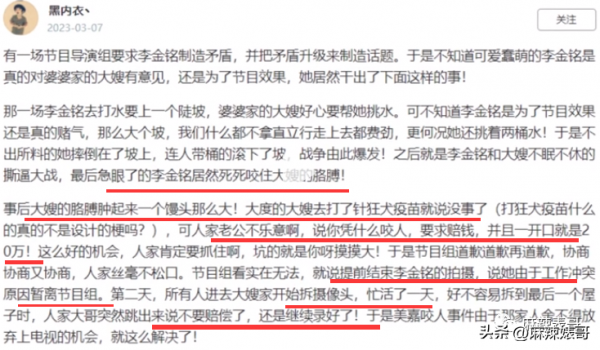 有网友说李金铭和大嫂开撕的那一次,生气把"大嫂"胳膊咬了,"大哥"要节目组赔偿20万,节目组道歉也于事无补,遂决定结束拍摄,摄像头快拆完的时候,"大哥"退步了,表示不要赔偿,继续录制。