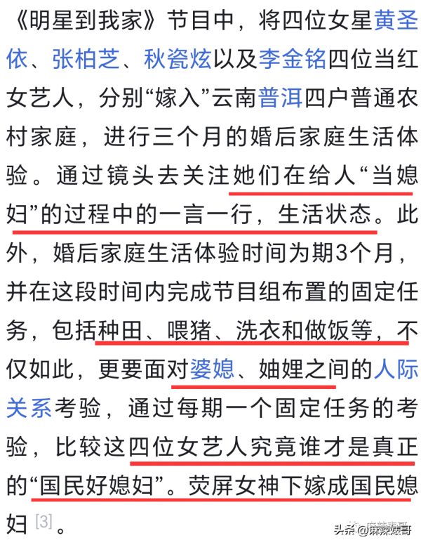 韩国是艺人住普通人家,江苏卫视是把女艺人以"媳妇"的身份"嫁入"农家。美其名曰,在节目中接受全新的家庭关系考验。