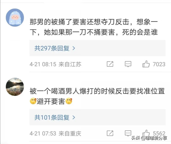 那男的被捅了要害还想夺刀反击,想象一下,她如果那一刀不捅要害,后果不堪设想,反击的时候谁能准确避开要害呢?