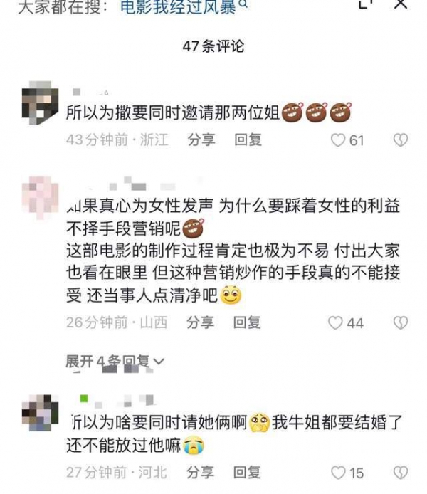 热搜话题里网友也纷纷表达不满,为女性发声的电影,居然如此消费女性,这两位都并不是主创圈子里的人,而且秦牛正威已经结婚,何必踩着女性去为电影宣传。