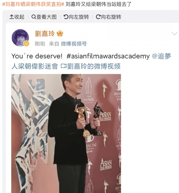不过抱怨归抱怨,刘嘉玲还是愿意在重要场合跟着梁朝伟到处跑,比如前段时间梁朝伟在国外出席各种活动,实时更新影帝的动态,刘嘉玲被调侃是梁朝伟的最强站姐。