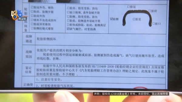 轮胎检测报告显示故障原因是"轮胎使用过程中因冠部被刺或肩部,胎侧被割伤造成漏气,缺气行驶导致轮胎胎侧损坏,不属于轮胎制造质量问题,不予理赔"