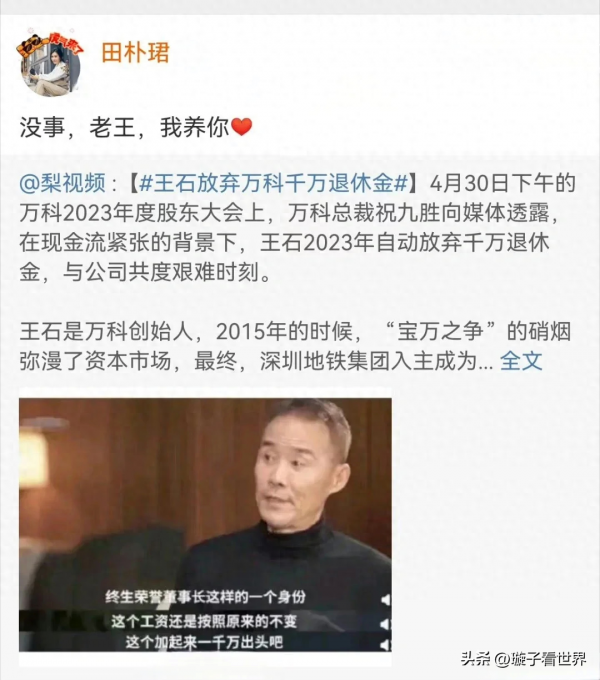 5月1日晚,王石的小娇妻田朴珺在得知这一消息后,以一句"没事,老王,我养你"表达了对丈夫的支持。