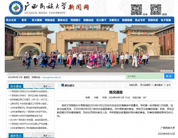 我校文学院院长叶君教授在2024年3月22日校内发生的交通事故中受重伤,学校第一时间联系120送医,经全力抢救无效,于2024年4月9日14时8分在医院离世。对叶君教授的离世,学校万分悲痛和惋惜!目前,学校正敦促警方尽快查明真相、及时处罚相关责任人员,并积极配合家属做好相关善后事宜,对事故调查结果将及时公布。