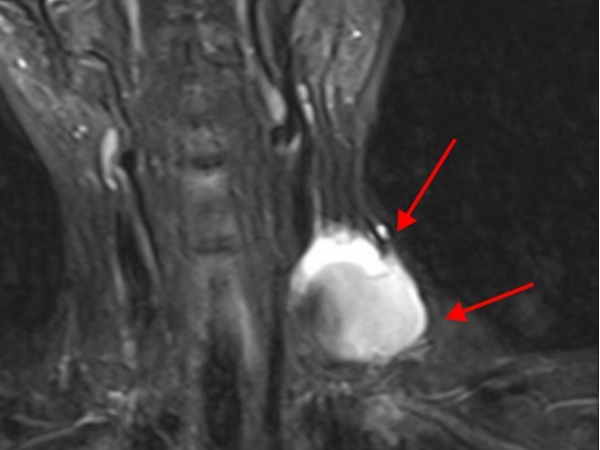 冯医生仔细询问文女士的病史,对病变部位进行了详细的专科查体,结合文女士既往的检查资料与影像图片,冯医生当即明确左颈内静脉假性动脉瘤的诊断,并且该疾病的发生与文女士症状出现当天的颈部按摩可能存在直接的关系。