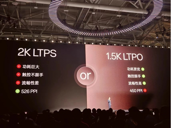 一个典型例子是屏幕,李杰在现场提到,一加Ace 3搭载的1.5K LTPO屏幕(自适应刷新)具有"功耗更优、触控跟手、流畅性高"等优势,而Redmi K70使用的2K LTPS屏幕"功耗巨大、触控不跟手、流畅性差",唯一的优势是像素密度更高,可以达到526 PPI,而1.5K LTPO屏幕为450 PPI。