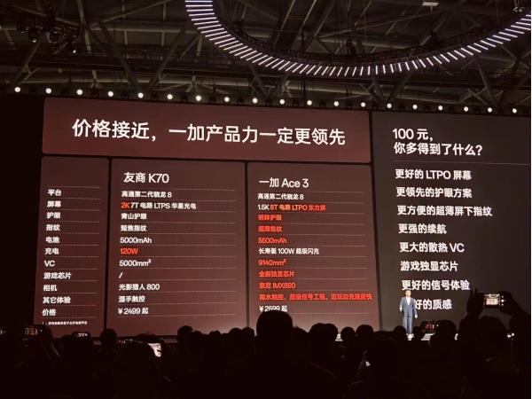更具火药味的,还是直接对比市场销量。李杰在现场提到,一加2023年销量同比增长285%,成为2500元以上线上市场安卓第二名,2022年发布的一加Ace Pro销量是"友商K50至尊版"39%,而2023年推出的一加Ace 2 Pro销量达"友商K60至尊版"的82%,已呈现反超之势。