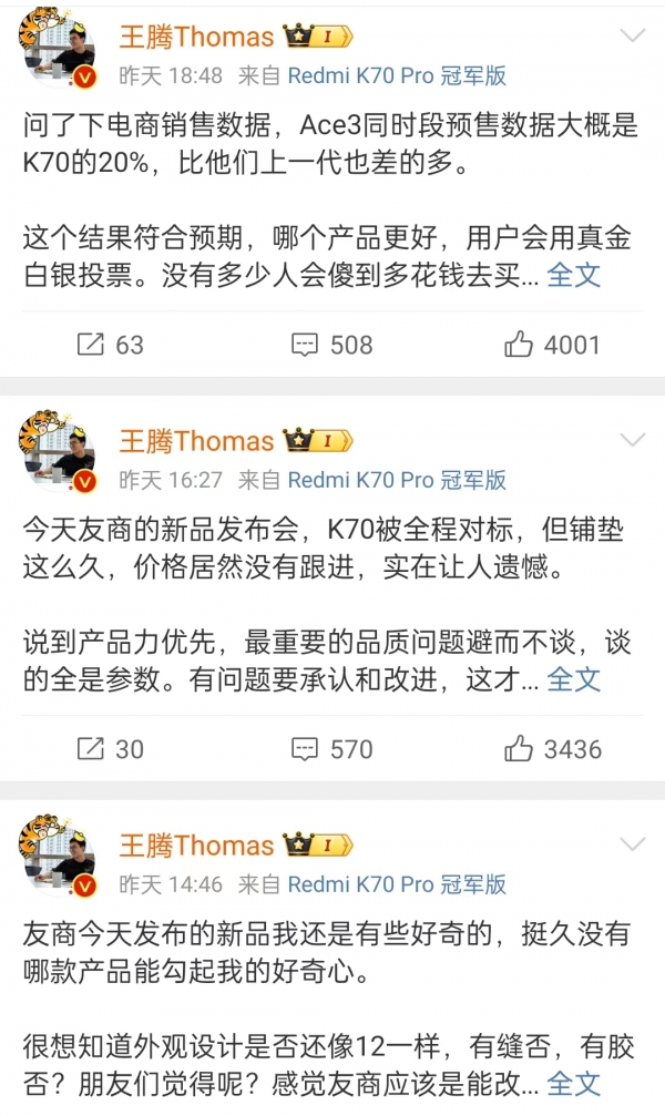 随后在一加Ace 3发布会期间和之后,王腾连发数条微博评论"Redmi K70被友商对标"一事,言辞间火药味浓厚,直接质疑一加品控。比如他写道,"问了下电商销售数据,Ace3同时段预售数据大概是K70的20%,比他们上一代也差的多。这个结果符合预期,哪个产品更好,用户会用真金白银投票。没有多少人会傻到多花钱去买产品力更低,可能还有质量问题的产品。"