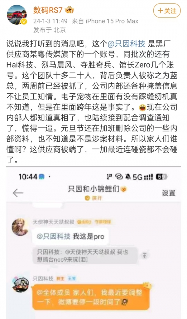 1月3日有数码博主发文称,"@只因科技是黑厂供应商某粤传媒旗下的一个账号,同批次的还有Hai科技、烈马晨风、夺胜奇兵、馆长Zero几个账号。这个团队十多二十人,背后负责人被称之为蓝总,两周前已经被抓了"、"元旦节还在加班删除公司的一些内部资料,也不知道是不是涉案材料。所以家人们谁懂啊?这供应商被端了,一加最近连碰瓷都不会碰了"。