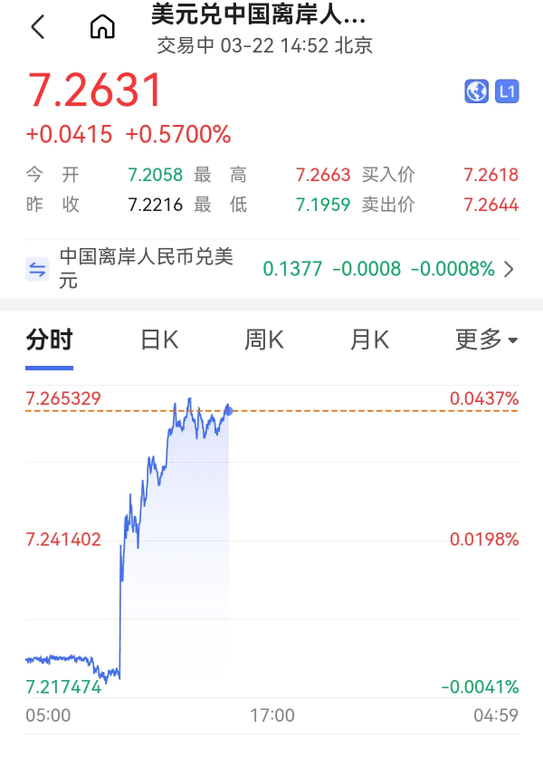另一方面,3月22日中国人民银行公布的人民币兑美元中间价调降62个基点至7.1004,创下自今年2月初以来的最大单日降幅。中间价的大幅下调,直接对人民币汇率产生了下行引导作用,加剧了人民币汇率的波动幅度。
