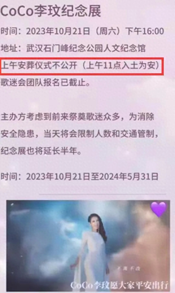 李玟的家人为她的告别仪式和纪念展做出了周全的安排。告别仪式定于10月21日上午11点正式举行,虽然仪式不对外公开,但为了确保安全,主办方实施了人数限制和交通管制。