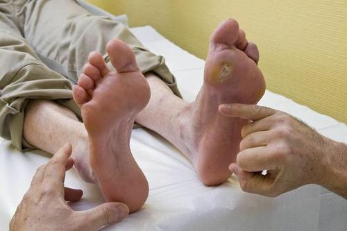 由于小动脉阻塞,微循环障碍,足背、胫后动脉波动减弱或消失。皮肤干燥,角化变脆,感觉神经减弱或消失,容易受到外伤感染,可形成神经损害顽固性溃疡。