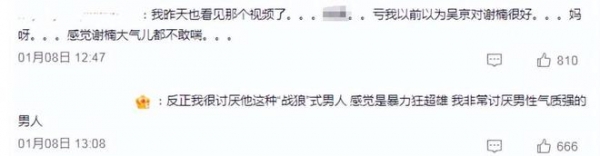 网友也替吴京妻子谢楠感到窒息,认为吴京太大男主主义,完全只顾自己的感受,而且动不动发脾气,让谢楠当着镜头忍不住落泪,不少网友都直言受不了。