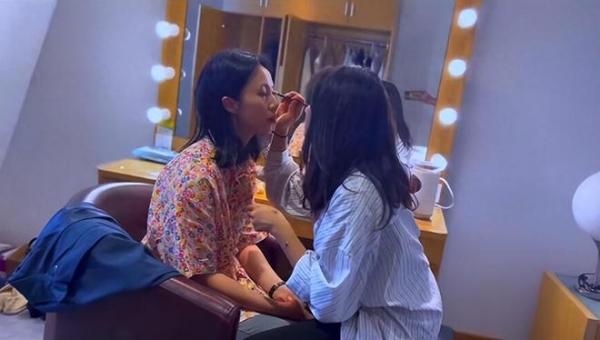 黄磊演完第一场戏份之后,坐在化妆镜前的孙莉也在赶忙补妆,准备即将登台演出。