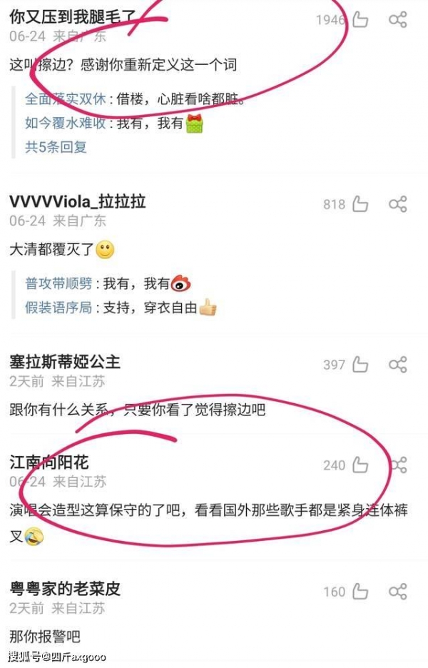 评论区里不少张韶涵的粉丝都在否认"擦边",说大清都没了,大家不要那么封建,演唱会上这样的造型已经很普通了,国外一些女歌手甚至都穿紧身连体裤衩。