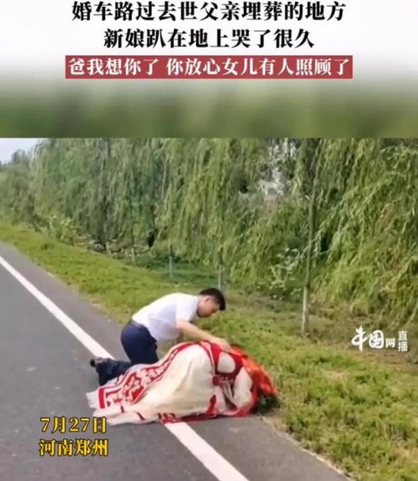 7月27日,河南,一段新娘出嫁时路过父亲下葬的地方长跪不起的视频引发热议。网友说,新娘一定很爱她的父亲。