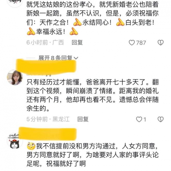 不过,也有网友认为,新娘这一跪确实震撼人心,人人都忍不住为她点赞。不过,当地有风俗,新娘还没有到婆家之前,是不能中途下车的,要不然会影响一生的幸福的。如果真的想父亲,可以在婚礼的前一天去父亲坟上烧柱香,告知一声。