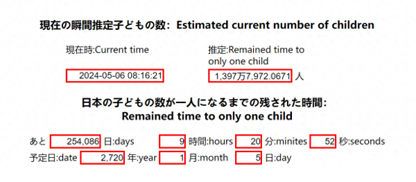 最新版日本"儿童人口时钟"数据显示,2720年1月5日,日本将只剩下一个孩子(6日截图)