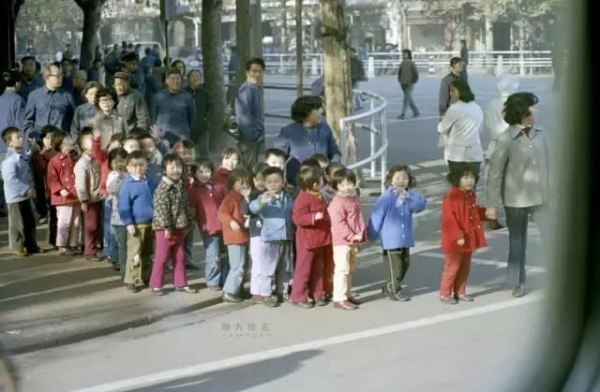 但祖国的花朵们还是穿得花花绿绿,在老师的带领下手拉手过马路。