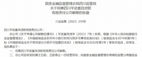 日前,据国家金融监督管理总局四川分局的两则批复,其分别同意四川平武富民贷款公司、四川仪陇惠民贷款公司解散。