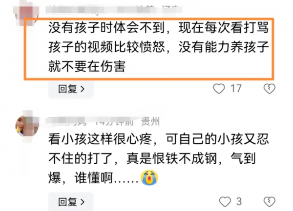 没有孩子时体会不到,现在每次看打骂孩子的视频比较愤怒,没有能力养孩子就不要在伤害。