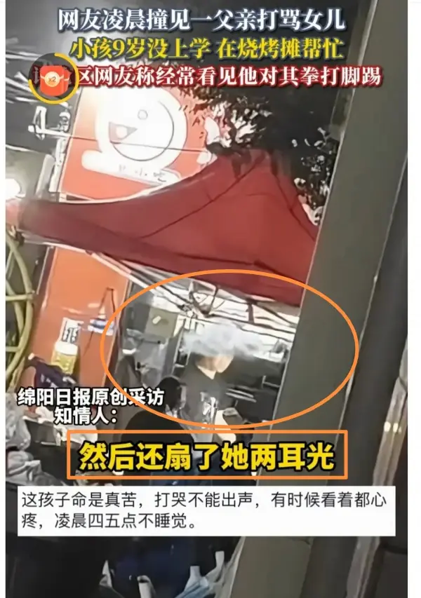 小女孩每天深夜帮父亲卖烧烤,经常通宵达旦,父亲却经常对女儿谩骂,拳打脚踢。