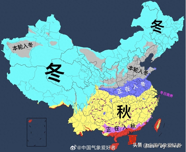 随着冷空气吹遍大江南北,我国中东部换季进程骤然加速。全国冬季总面积已经超过秋季,南疆、河西走廊等几个秋季飞地被全部清除,黄河以北已经全面入冬、正在入冬的区域已挺进江淮江汉,南岭-武夷山以北都出现了日均温低于10度的冬日。