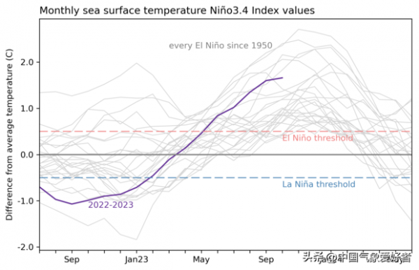 但和我国标准不同的是,美国海洋海洋大气管理局指出,这次厄尔尼诺现象现在已经达到了"强"事件的门槛!该局的分析数据认为,2023年8-10月的热带太平洋中东部Nino3.4关键海区的三个月平均海面温度比长期平均水平高出1.5度,月度Nino3.4指数比平均水平高1.7度,达到了强厄尔尼诺事件。