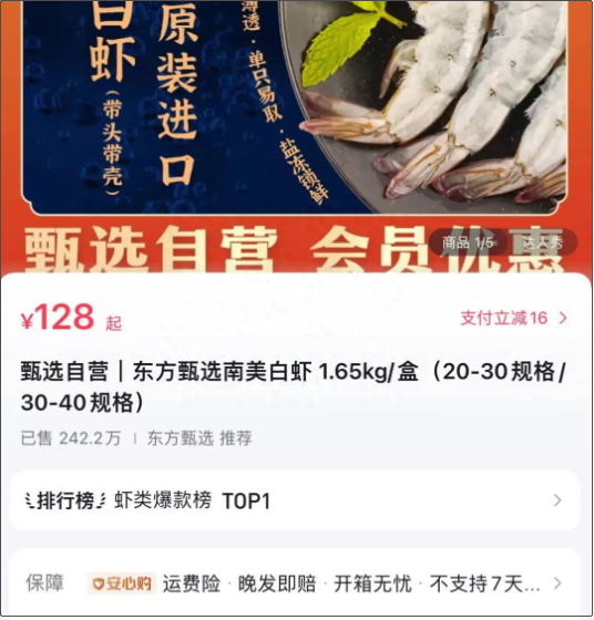 东方甄选方面对记者透露,自营南美白虾24日销量暴涨,截至当日17点,日销量已经突破2.5万单,远远高于日常的7000单销量。据悉,该虾已经售卖累计超过242万单,位列抖音虾类爆款榜Top 1。