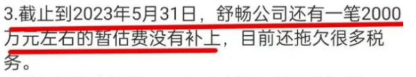 按照这位员工的说法,舒畅有一笔2000万元的税款一直没补,此外她还拖欠了更多税务,一时半会根本补不全。