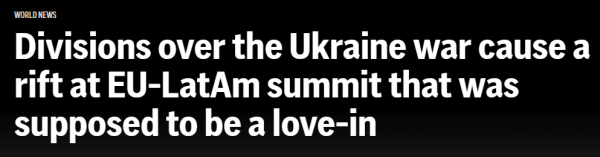 7月17日至18日,欧盟-拉美和加勒比国家共同体(拉共体)举行8年来首次峰会。美国"政治新闻网"欧洲版(Politico EU)认为,这场象征关系复苏的峰会已演变成一场"指责游戏"。欧盟和拉美争论数周后,峰会公报从16页缩减到9页,有关俄乌冲突的表述也从"最强烈谴责"变为"深表关切"。尽管如此,公报仍然没有得到拉共体成员的一致同意,尼加拉瓜外交部表示并"没有签署、批准或附随"这份公报。